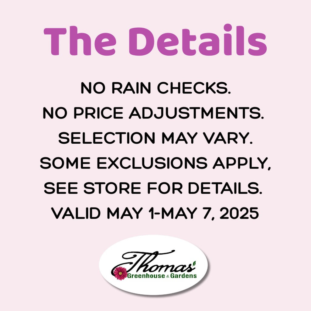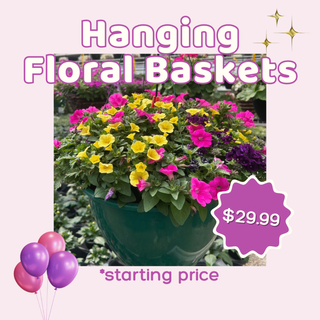 Treat Mom to something beautiful this Mother’s Day! Our greenhouse is bursting with blooms, baskets, and garden gifts she’ll love — all at special sale prices.